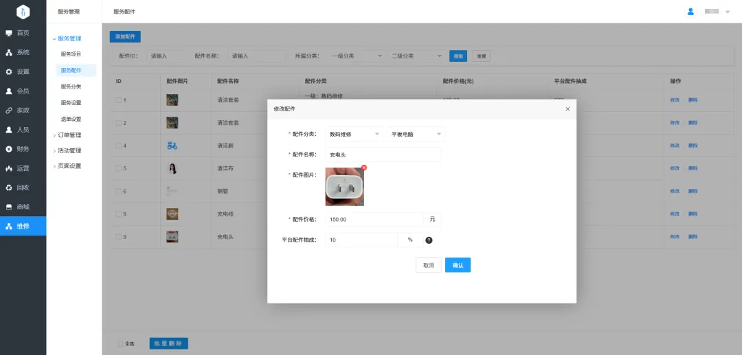 4.增加服务配件:配件分类同服务分类,用户下单时可选择是否添加配件(非必填),配件可设置平台配件抽成比例。