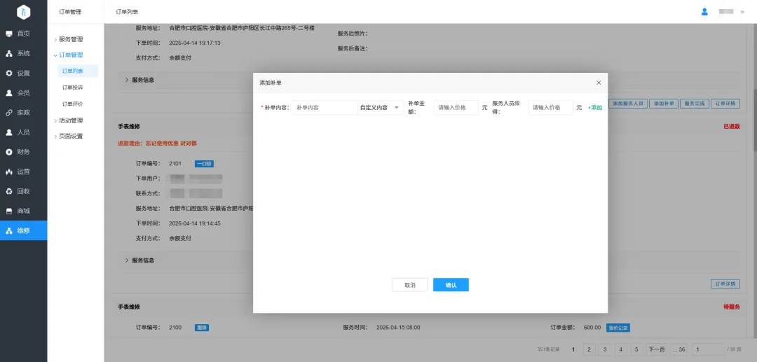 22.补单设置:可补服务项目、配件、自定义内容,可修改用户付款的补单金额。