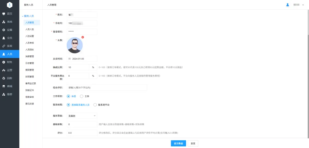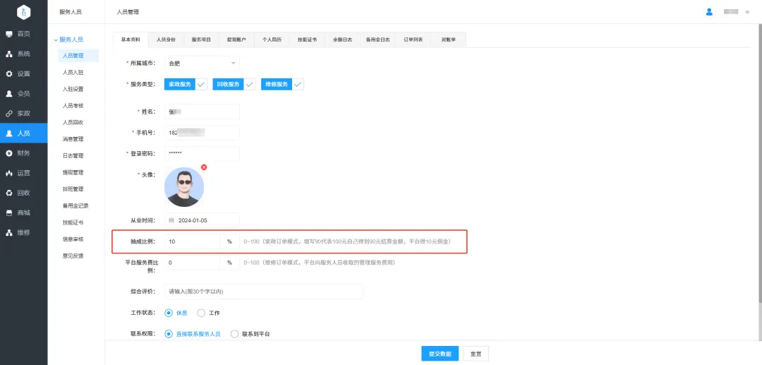 14.家政模块服务人员抽成:跟随服务人员抽成比例设置。
