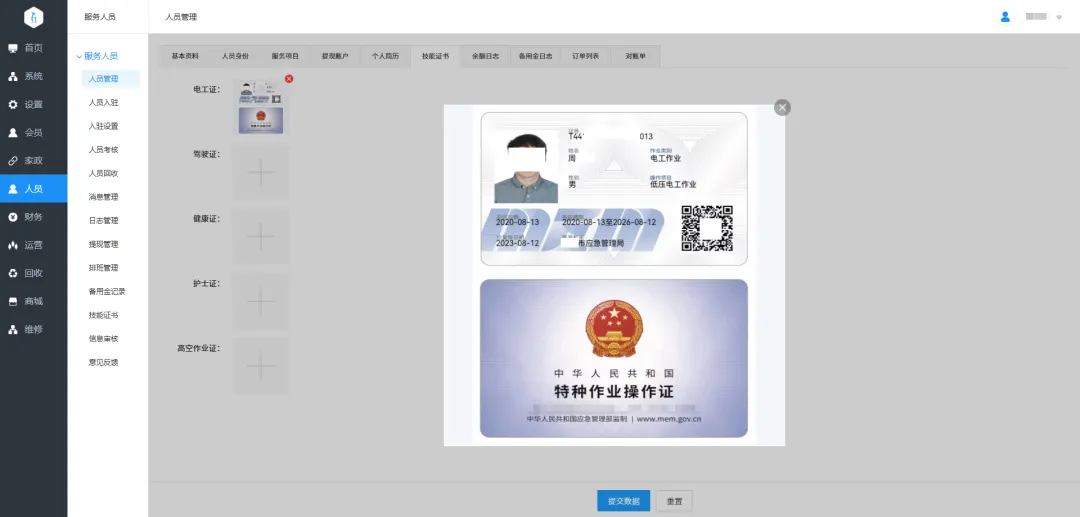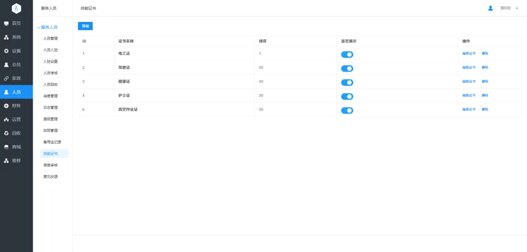 8.技能证书管理:平台可设置师傅需要上传哪些技能证书,并增加审核。
