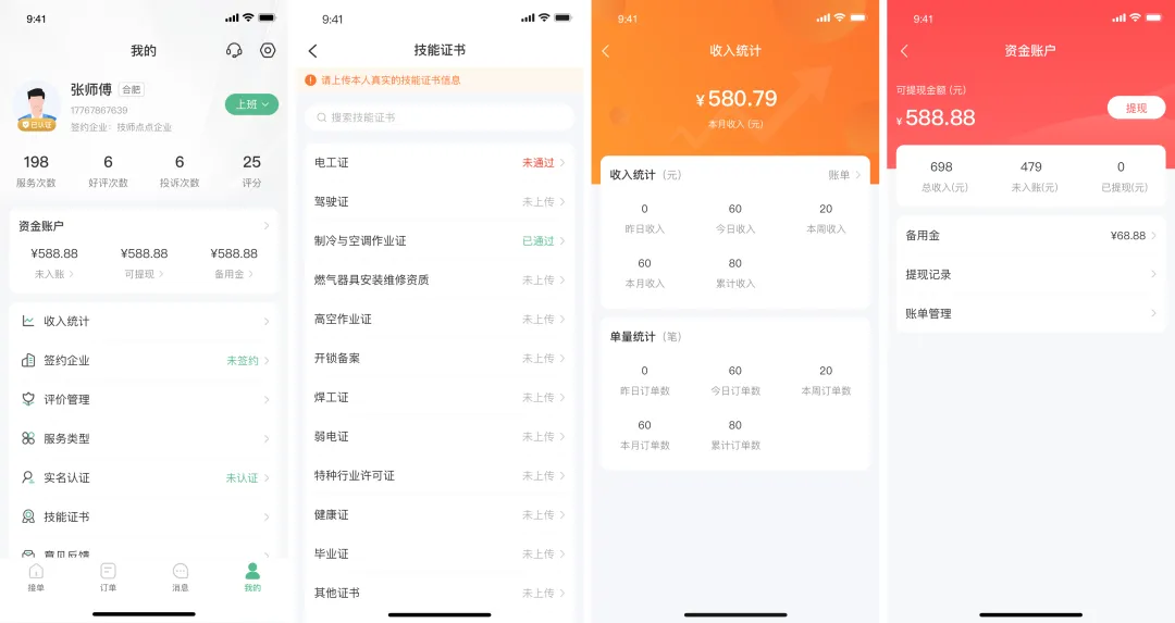 (4)我的(查看修改服务人员的基本信息,资金账户、收入统计、订单评价、关联服务、技能证书、实名认证等)