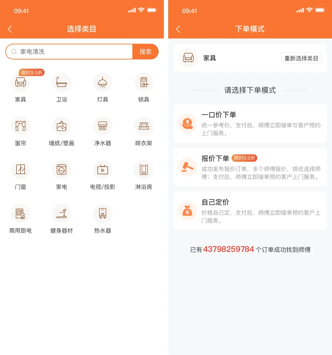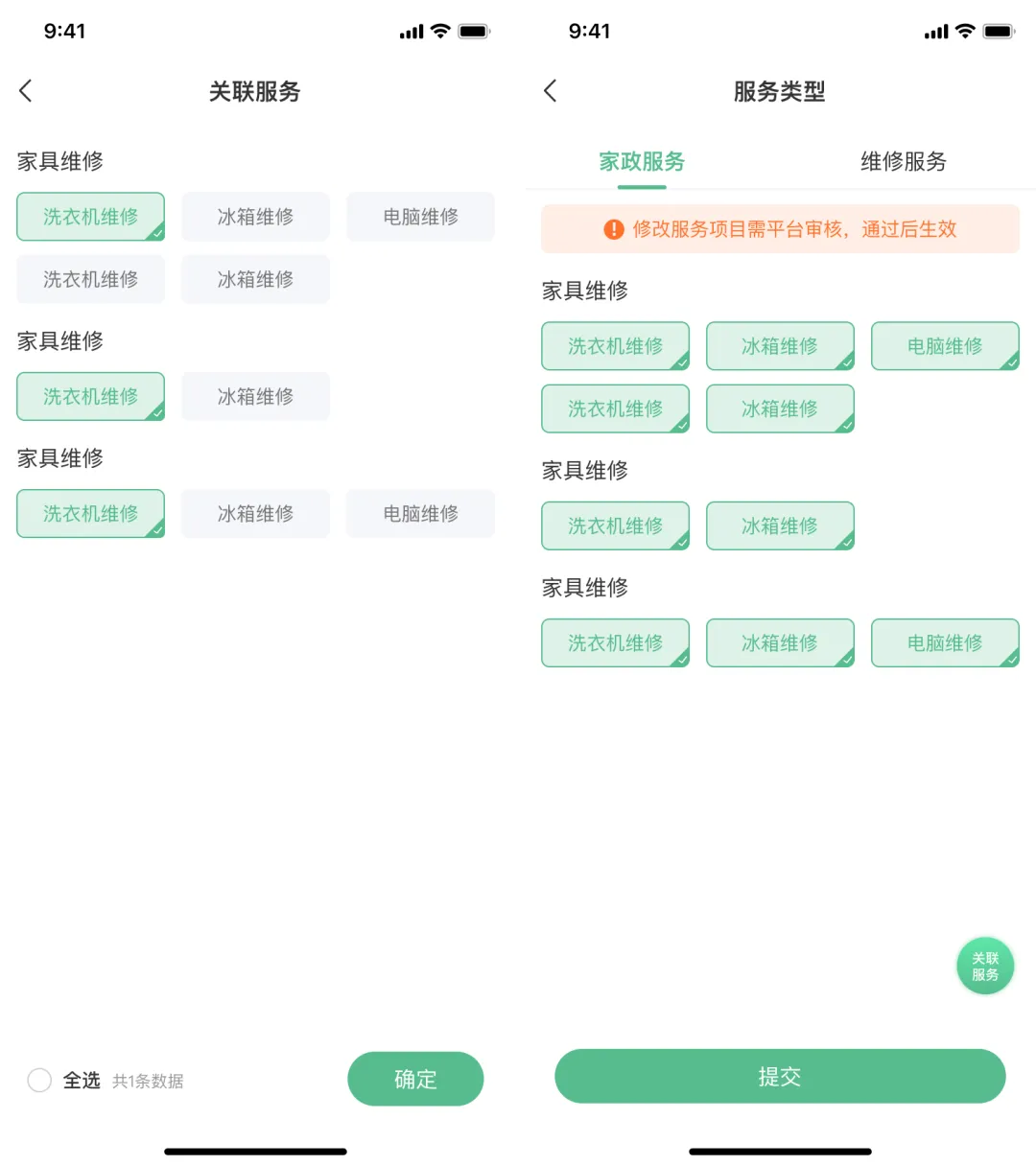 17.师傅端服务关联设置:服务人员可自主关联服务项目,平台审核。