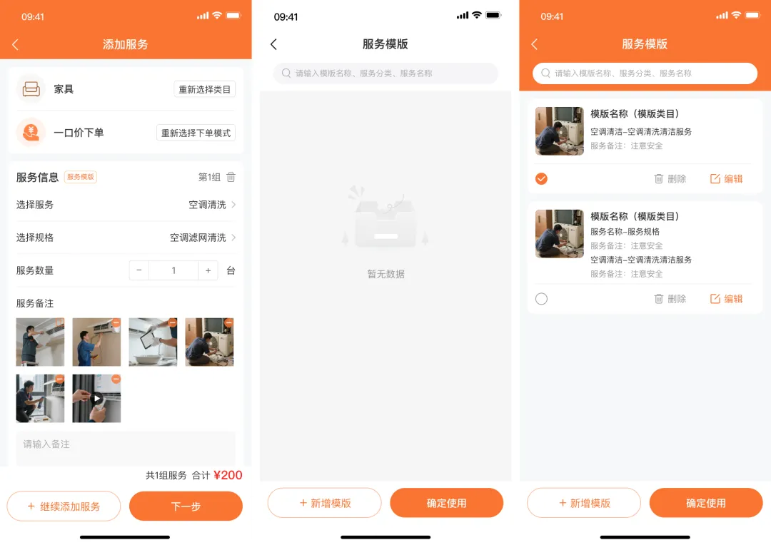 13.服务模板功能:用户可设置服务模板,选择服务模块可快捷选择服务,进行下单。