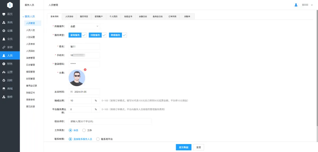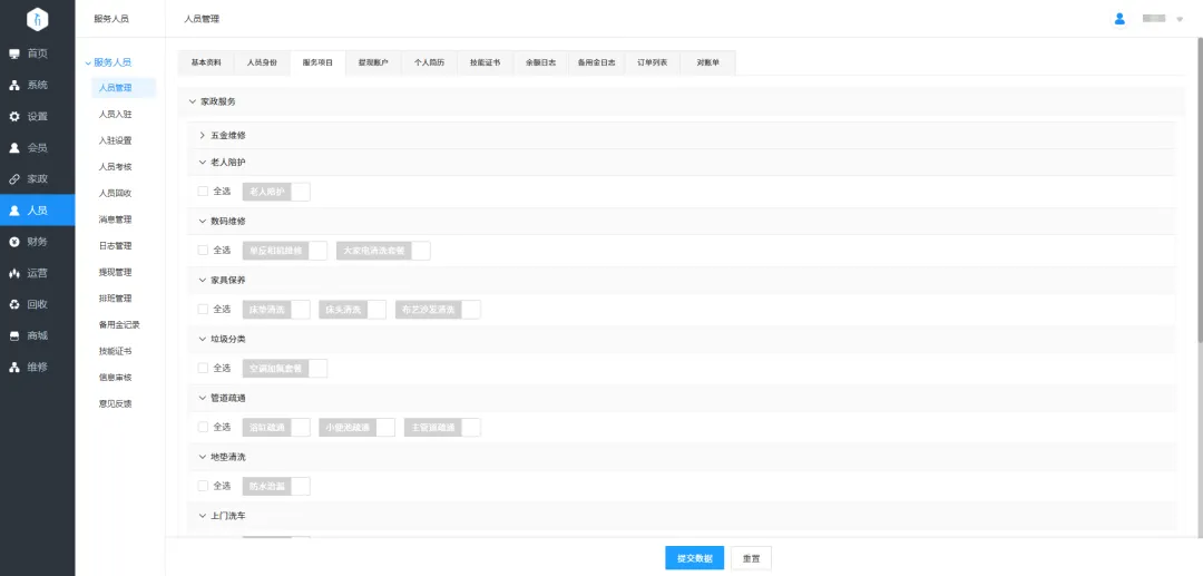 9.服务关联:可设置服务人员关联家政、维修、回收三种服务类型,并设置师傅关联这三种服务类型下的哪些服务。