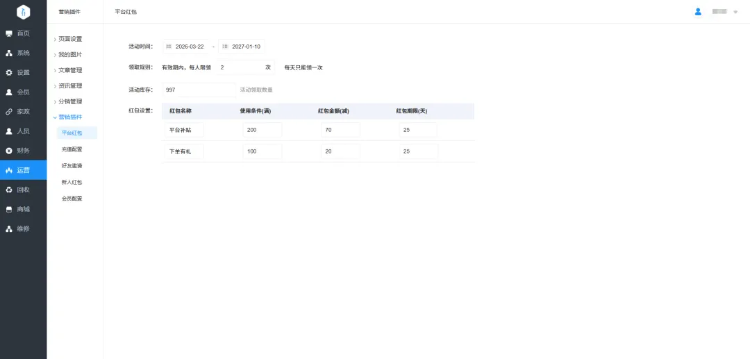 20.平台红包规则优化:领取规则改为有效期内每人限领多少次,每天只能领一次;红包期限可自定义设置。