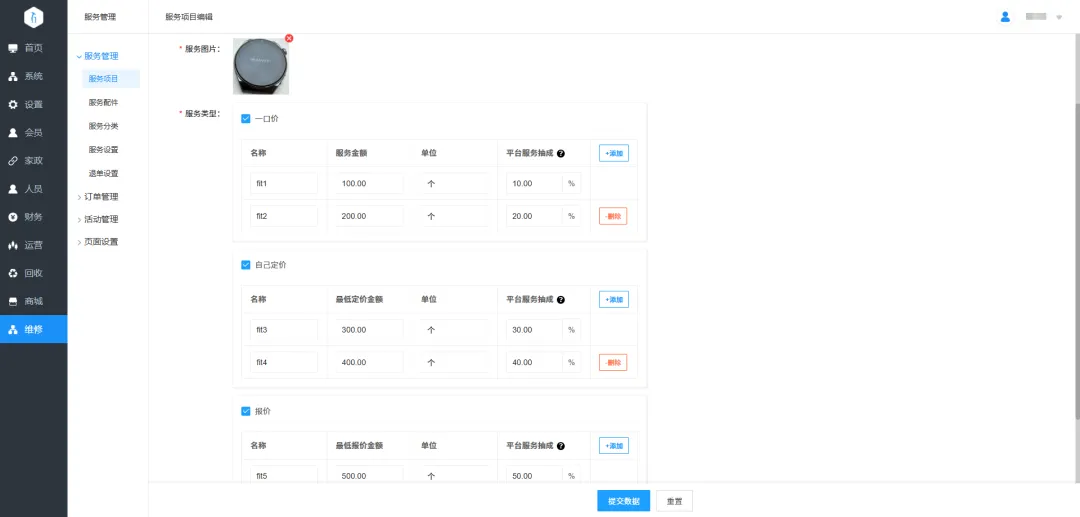 3.服务项目设置:维修服务项目可设置多个服务规格,每个服务规格可设置不同的金额,可多选这个服务支持这三个服务类型,每个服务规格都可设置平台服务抽成比例。