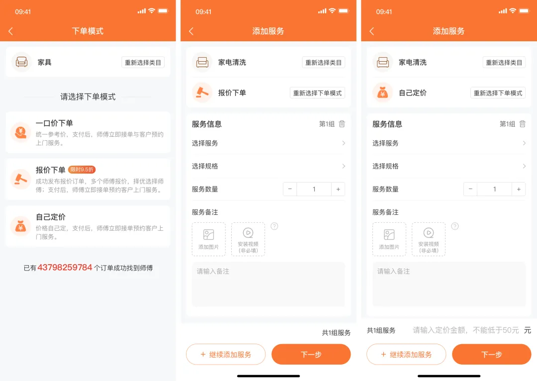 (3)报价下单(平台设置服务的最低报价金额,用户下单后,服务人员进行报价,报价金额不可低于最低报价金额,用户去选择师傅的报价);