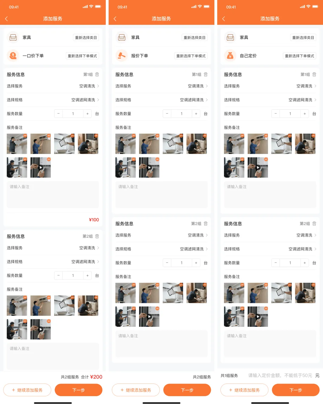 12.批量下单:用户下维修单,可同时下多个服务项目,并对每个服务项目上传视频/图片备注,订单出发前可修改服务地址、服务时间。