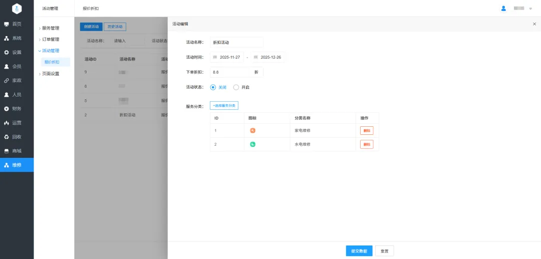 5.报价折扣活动:平台可以设置哪些分类的服务参与报价折扣,用户下报价单,可享受折扣。