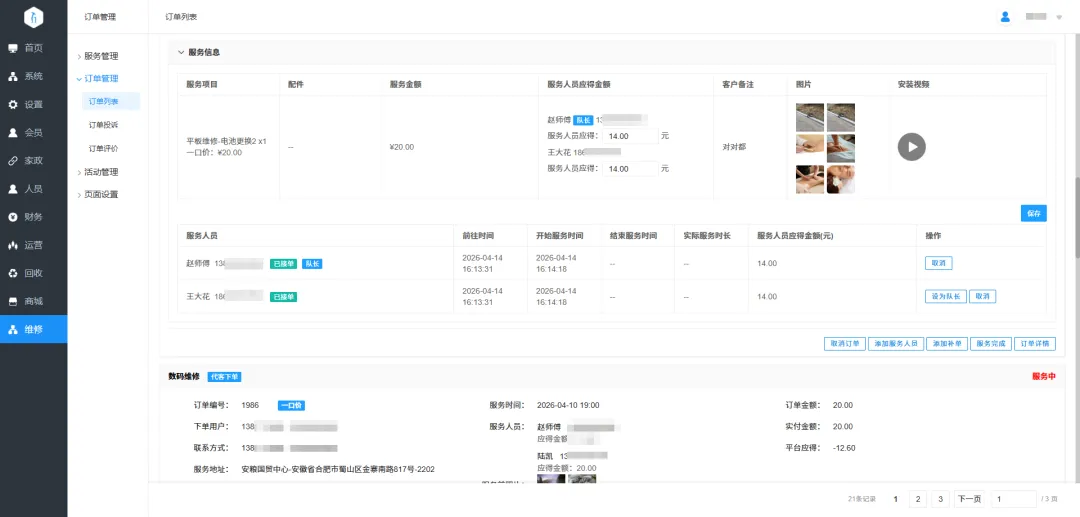 21.多师傅协作维修订单:维修模式订单可添加多个师傅服务同一个订单,每天派单时可设置师傅的应得金额;新增一个队长角色,在订单里队长操作订单流程。
