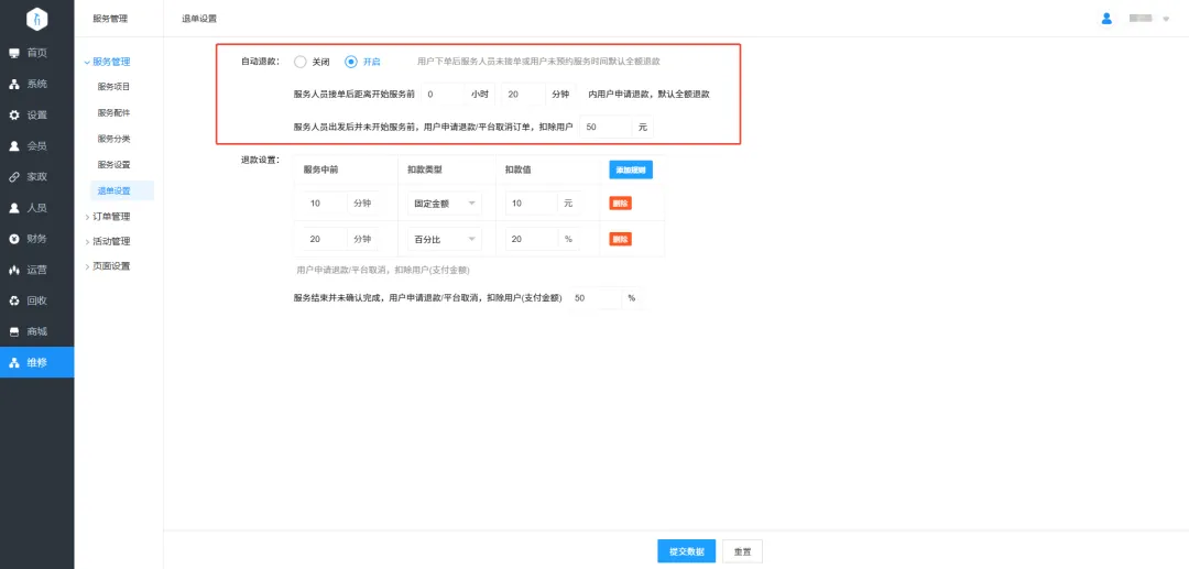 24.维修模式增加退单设置:可设置自动退款、服务人员在订单过程中退款要扣除用户支付金额比例。