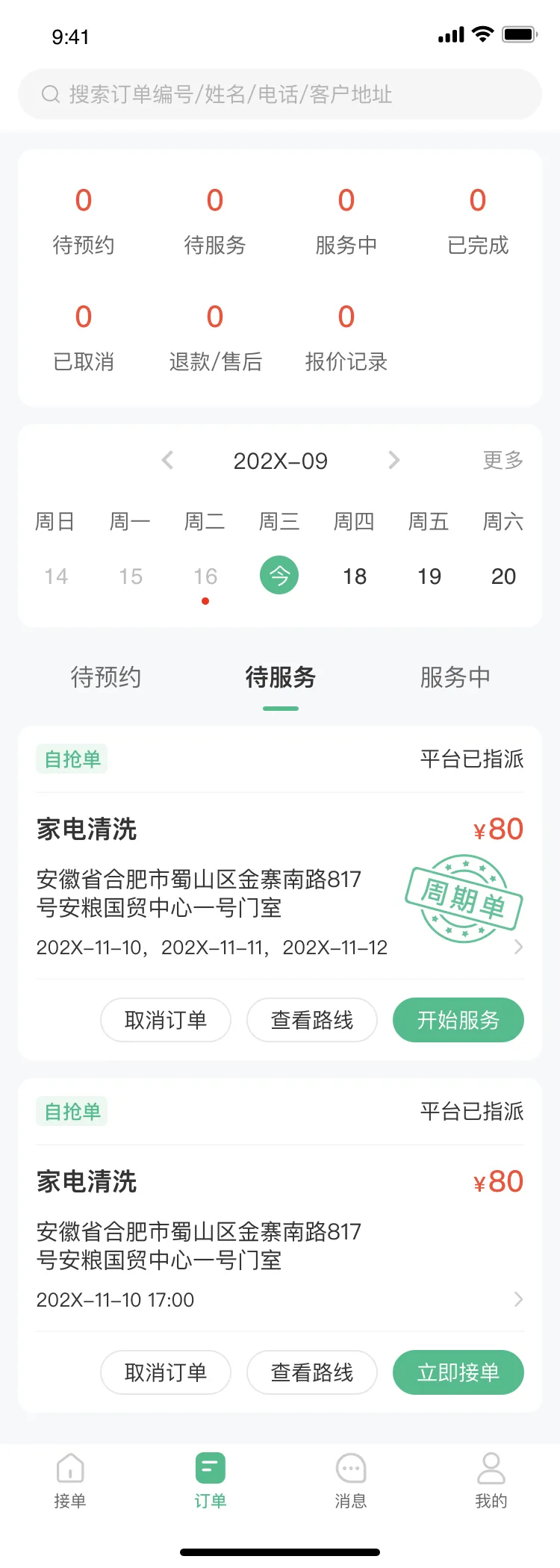 (2)订单(服务人员可查看所有订单状态的订单,还可以按照时间筛选订单)