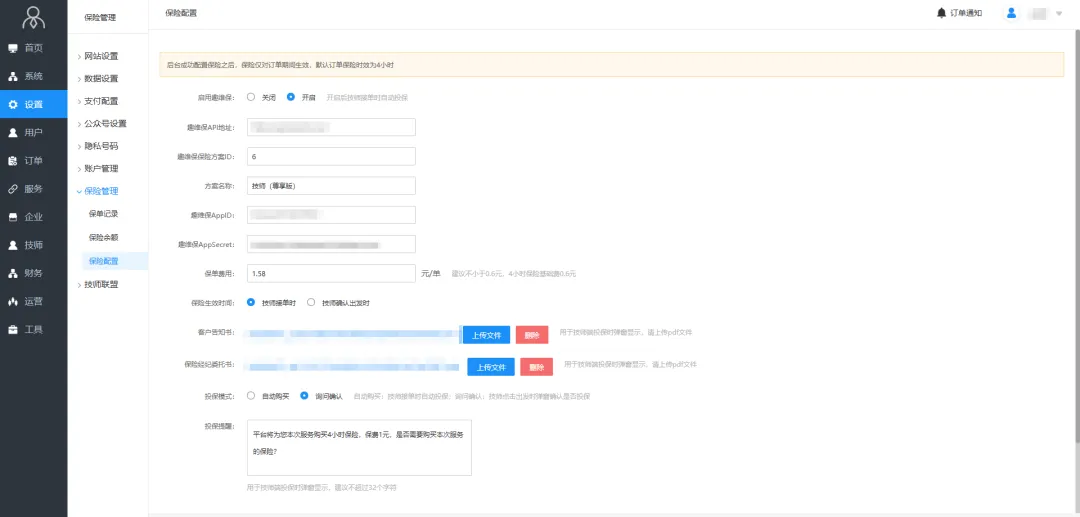 技师保险功能:一键为服务投保,解决平台、技师和用户的后顾之忧。