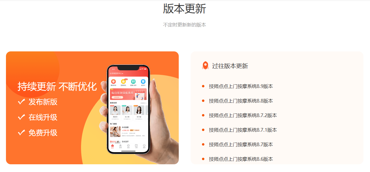 第三,系统的迭代更新记录,是稳定性的“试金石”。上门按摩行业的需求在不断变化,用户习惯、运营模式、政策要求也在持续调整,一套稳定的系统,必然需要持续迭代更新,才能跟上行业发展节奏,解决新的运营痛点。技师点点上门系统拥有专业的研发团队,始终坚持常态化迭代更新,从基础的订单管理、技师调度,到高级的营销功能、多端适配、隐私保护,每一次更新都贴合行业需求。仅2025年,就先后推出v8.3.2、v8.5、v8.6等多个版本,新增到店服务、多公众号绑定、自动提现等实用功能,同时优化bug、提升系统流畅度,让系统始终保持稳定高效,为平台运营提供持续的技术支撑,这也是稳定上门按摩系统推荐中,技师点点脱颖而出的核心原因之一。目前技师点点上门按摩系统已更新到v8.9版本。