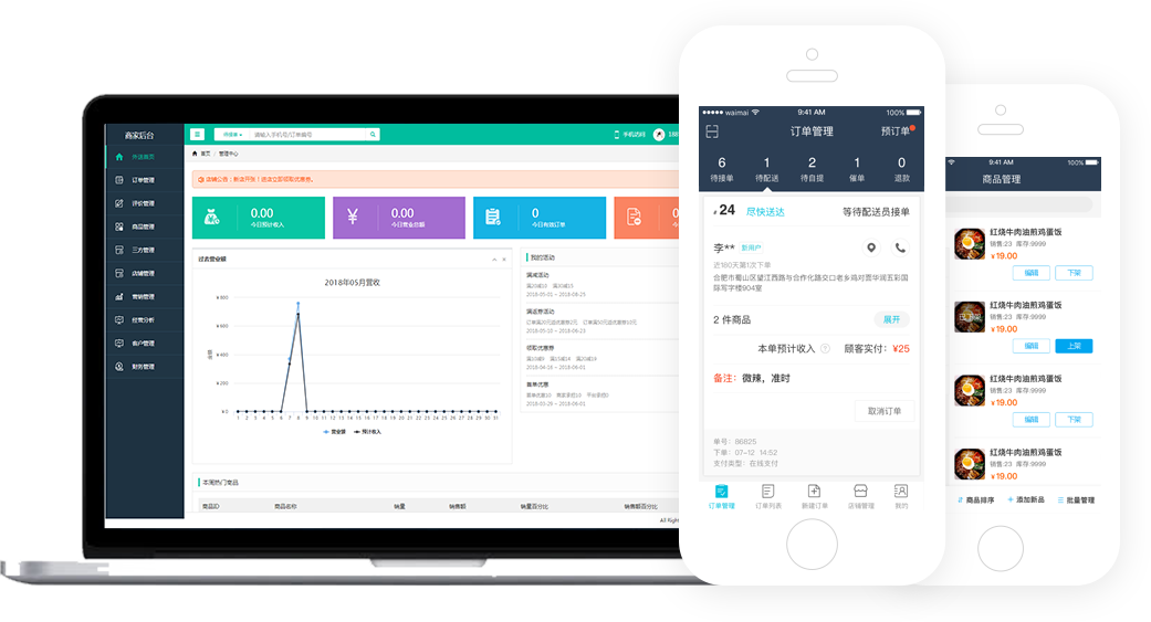商家端 (APP/小程序/H5): 商家可通过多种方式便捷接单,新订单实时语音播报,杜绝漏单。强大的后台功能,支持商家自主进行商品管理、营销活动配置、财务对账及在线提现。权限体系精细,可为主/子账号设置不同操作权限。