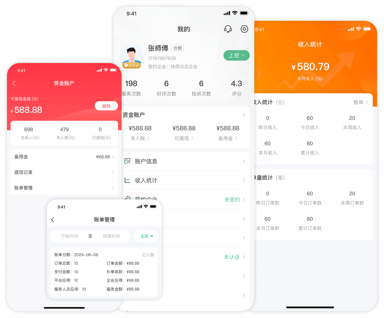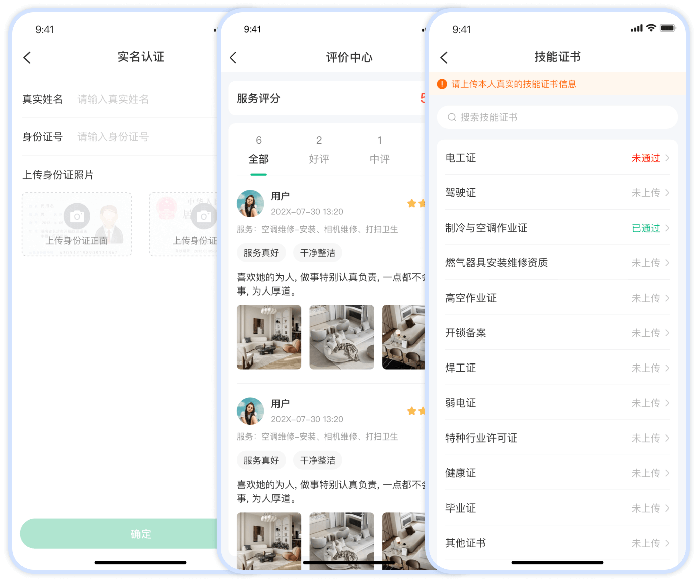 师傅端-实名认证、技能证书上传与订单评价展示,三位一体构建可信赖的专业形象,让好服务被看见、被认可,直接转化为更多订单与更高收入