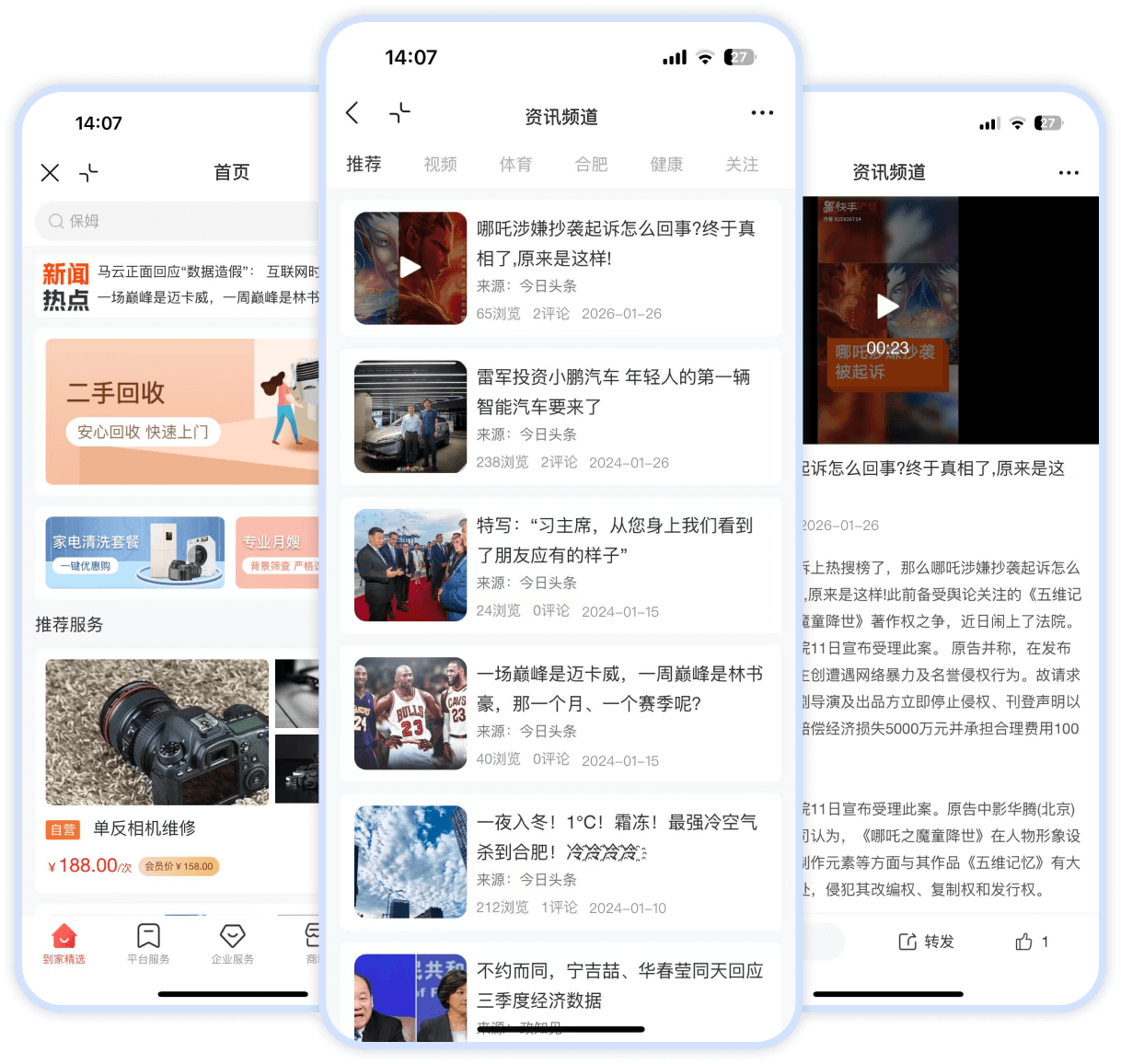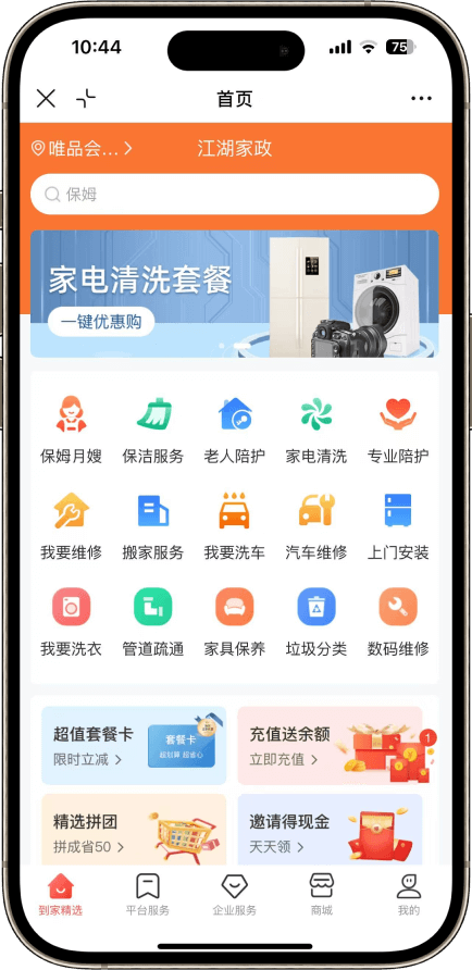 集各类生活服务快捷入口、搜索与需求发布工具、优惠营销活动及增值板块于一体,一站式满足用户的家政服务需求