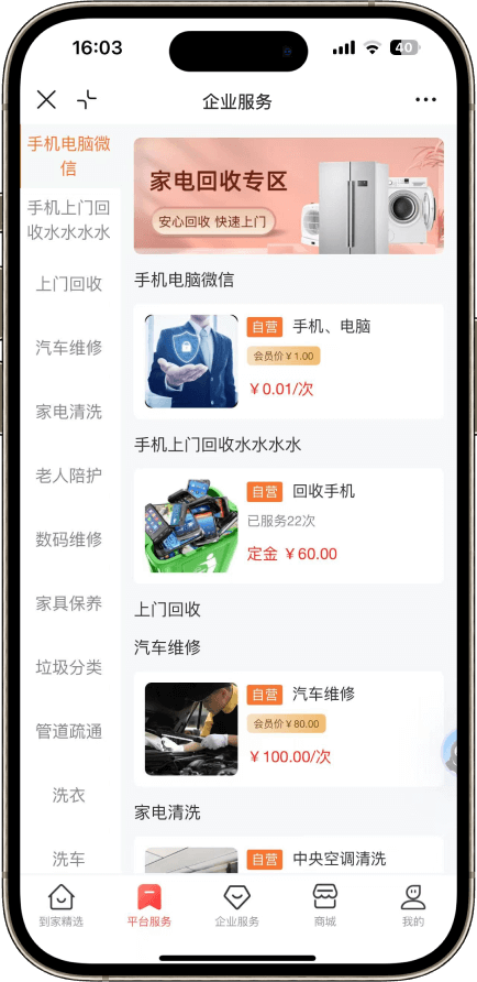 提供涵盖家电回收、数码维修、家政服务、家具清洗等多品类的生活服务,用户线上浏览、选择并下单各类上门服务