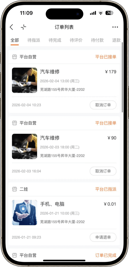 用户端订单页,订单全状态让服务进程一目了然,让消费信任与平台掌控尽在掌握