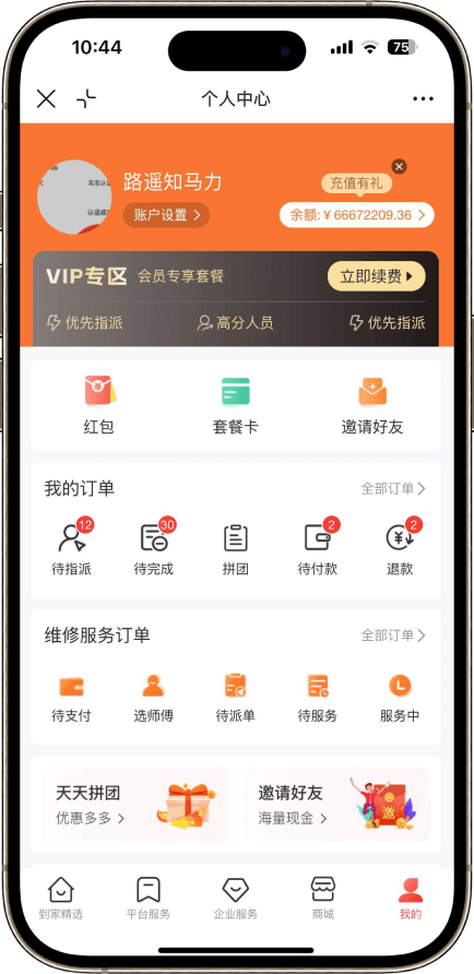 主要提供账户与会员权益管理、我的订单和维修服务订单管理,邀请好友等营销互动功能,一站式管理用户的家政服务相关权益与业务