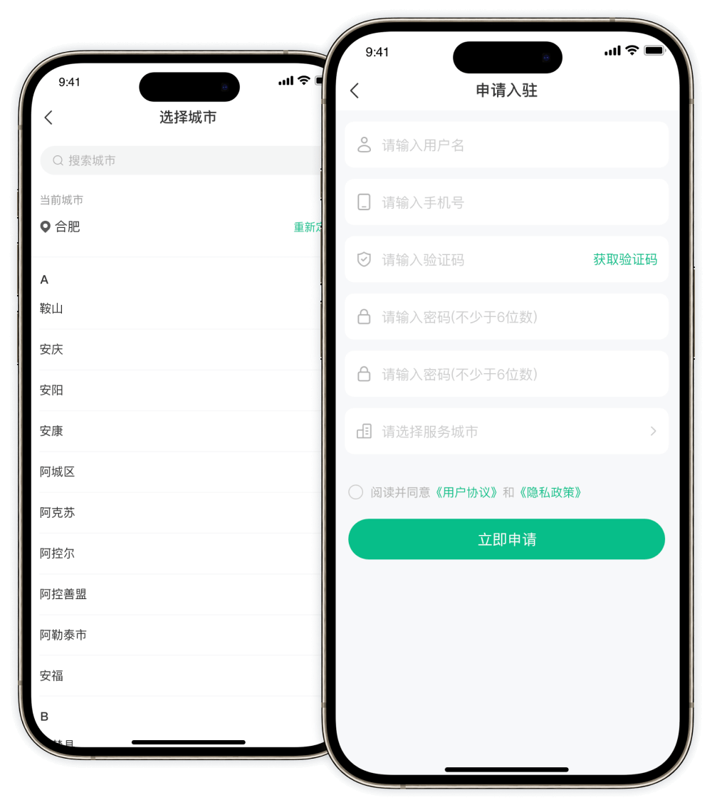 师傅需要填写姓名、手机号码、选择入驻城市、等待平台审核通过,审核通过之后即可进行接单等服务